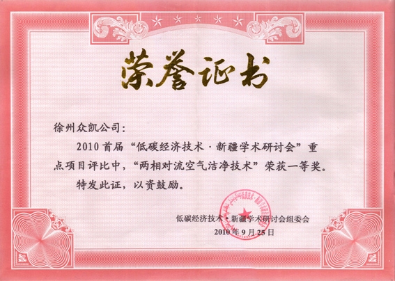 2010年9月25日,由徐州眾凱公司自主研發(fā)的“兩相對流空氣潔凈技術”在2010屆“低碳經濟技術·新疆學術研討會”重點項目評比中榮獲一等獎。