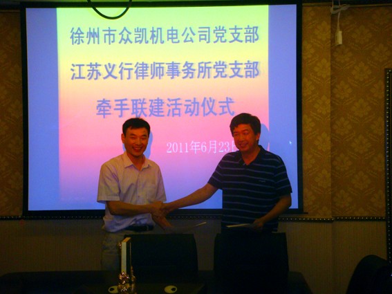 在喜迎中國(guó)共產(chǎn)黨成立90周年之際,徐州眾凱公司黨支部成員王總和江蘇義行律師事務(wù)所黨支部戴書(shū)記于6月23日分別代表各自黨支部,喜簽黨建共建協(xié)議,結(jié)成共建單位。并進(jìn)行座談交流。